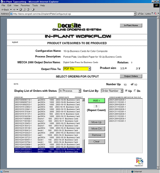 Individual orders can be imposed together to make the most efficient use of materials and machines. Once orders are selected for processing, they can be proofed using PDF, or immediately output to the appropriate printing system.