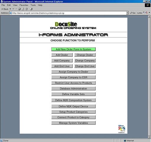 The System Administrator has complete control over all the database tables, and can quickly setup new companies, dealers, and customers. New products can be added as they become available, and products can be configured and packaged in sets for selected customers.