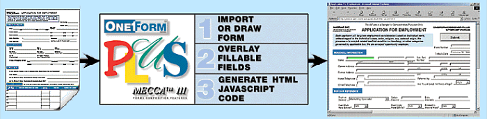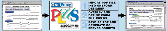 After the form design is fielded, it can be generated as a fillable HTML e-form or PDF form. Most importantly, JavaScript code is automatically produced along with server-side scripting for saving and recalling the filled-in forms from a website server. The diagrams below show the OneForm process to create electronic forms.